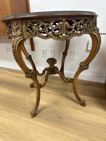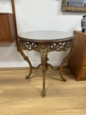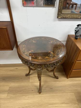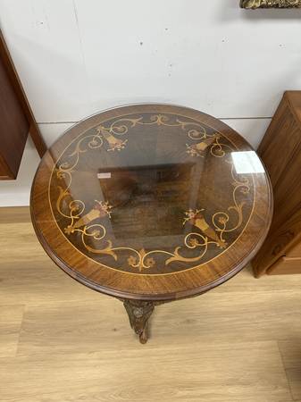 Vintage Rococo Style Marquetry Parquetry Floral Glass Round Side Table. Measurements: 28.25”D × 30.25”H