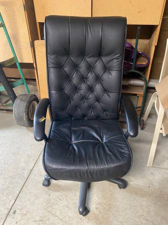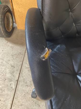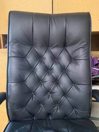 Comfortable and functional rolling black office chair with armrests. One armrest has a rip, and the chair is dusty from storage (see photos). Dimensions are 27” wide x 24” deep. Height is...