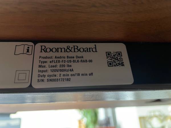 Aedric Standing Desk from Room&Board. Solid Walnut top and black metal legals. Standing desk functionality works perfectly. Some discoloration on the top due to sun exposure where a monitor was (see photo) and very light marks/scratches, but otherwise in great condition.