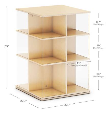 Guidecraft's EdQ Collection offers a full range of versatile furniture to satisfy all of the unique needs of early childhood classrooms, homeschools, and kids' play areas. Each piece is available in a natural wood or white finish and in a variety of sizes to ensure that young children have agency over their choices. Designed for young readers with big imaginations, the EdQ Rotating Big Book Display is the perfect space-saving addition for any reading or learning environment. The bookshelf features three different cubby sizes with spacious compartments at the bottom, medium in the middle, and smaller ones at the top. It offers organized storage for books of all sizes, while the smooth-spinning base and clear acrylic sides invite children to independently explore their favorite titles. Large and sturdy enough to hold plenty of storybooks, toys, and learning materials, this Greenguard Gold Certified wooden bookcase is the ideal way to keep preschool classrooms, libraries and playrooms organized and inviting. Measures 22.75"W x 22.75"D x 34.75"H
