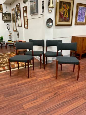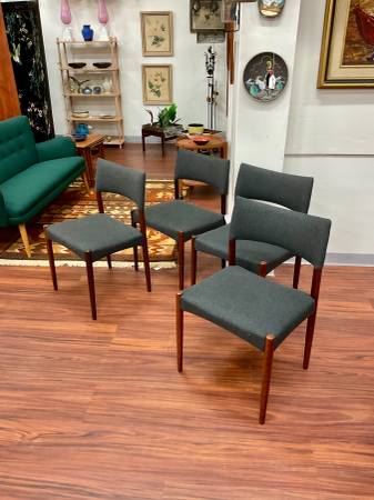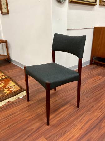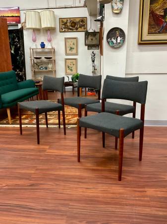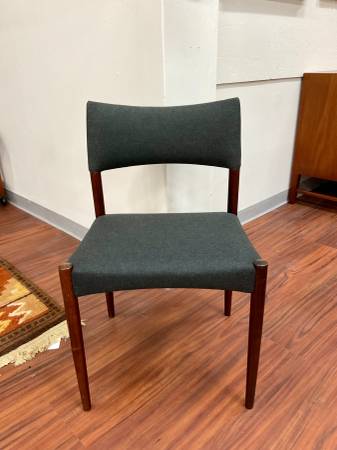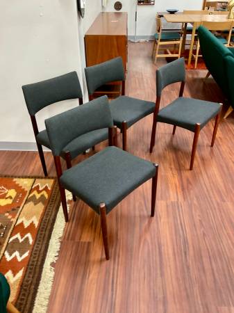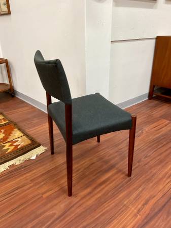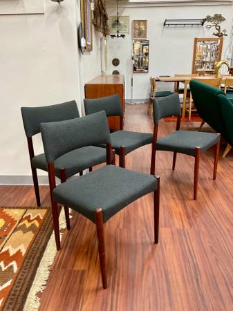 Set of 4 Danish Modern Rosewood Dining Chairs New Upholstery Dimensions: 20”W x 17”D x 37.5”H Seat Height: 17.75”H