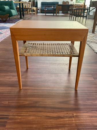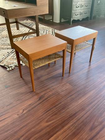 Set of 2 Danish Teak & Rattan Nightstands Vintage Mid Century Tables By Severin Hansen for Haslev. Dimensions: 19.5”W x 13.75”D x 19.75”H