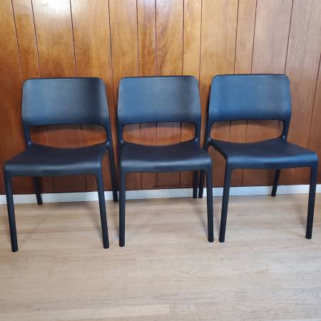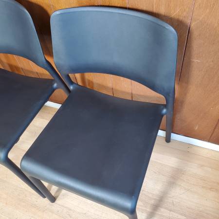 Good condition set perfect for your contemporary modern diner. Not without signs of use, some scratching and scuffing throughout, but blends easy enough on the matte black molded plastic. Surprisingly comfortable for a rigid design from the industrialist office seating aficionado.