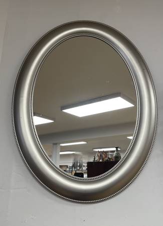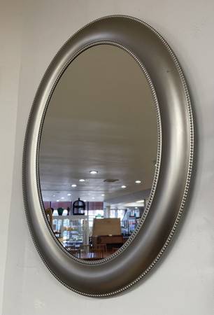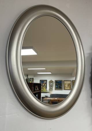 Silver Framed Oval Mirror. Sold as Found. Measurements: 24”W x 29.5”L