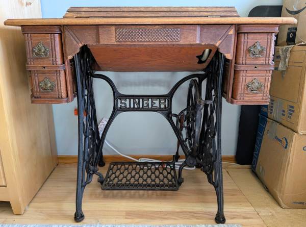 Free to a good home (will need some renovation of the top surfaces) Singer Sewing Table with 4 drawers; top surface veneer will need replacement/refinishing