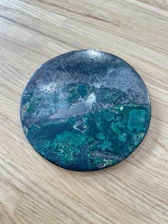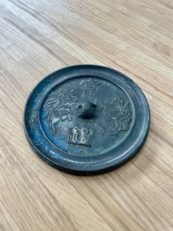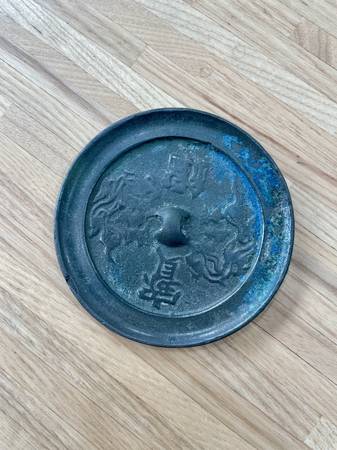 Small silvery-colored bronze mirror with inscription, burial patina, China Dimensions: 3.5”W x 3.5”D