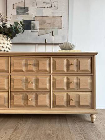 Professionally refinished solid oak dresser sanded down to raw wood, stained and sealed to showcase a striking wood grain, raw wood inside the drawers/dresser nourished with beeswax, new solid brass hardware, drawers lined with waterproof liners, 9 spacious drawers glide very smoothly.