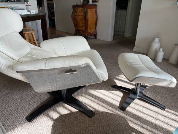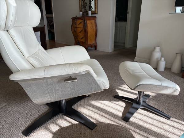 Like new condition - genuine leather not vinyl. Reclines to create a zero- gravity/stressless feel. Headrest adjusts up/down. Shipped new from designer store on the East Coast that manufactures their own furniture.