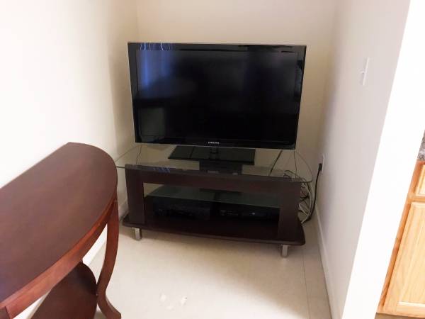 TV stand in great condition. Cherry color plywood with glass shelf and glass top.