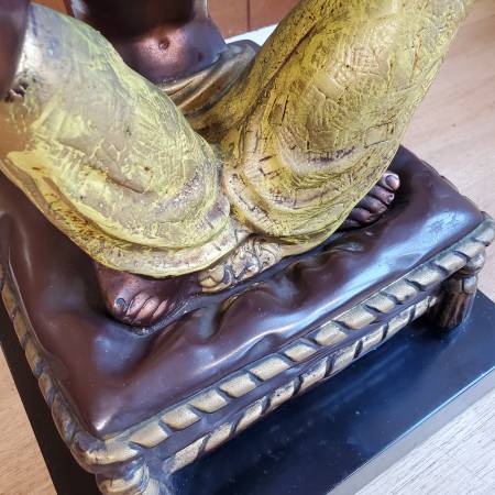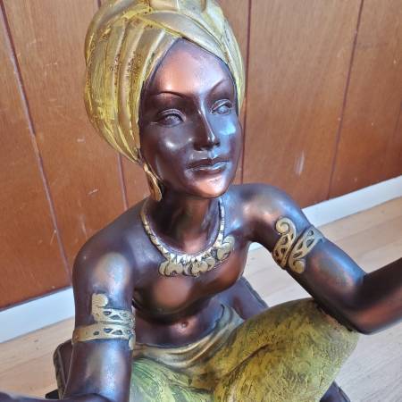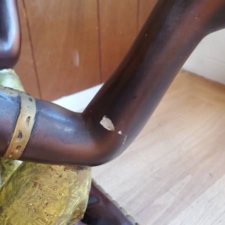 Certainly a controversial trope movement from the mid-century era, this nobly dressed seated statue is often found accompanying Art Deco decor with his gilded attire and scepters. Sourced from an estate with imports from around the globe this was a singular piece, though usually accompanied by a matching coffee table and in a pair. Your chance to own a piece of the timeline of historical stylings in both art and furniture. It does have a chip and crack in the right arm that doesn't go all the way around and is still structurally sound--would not be a piece to hold much weight.