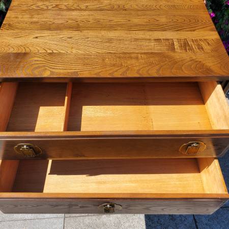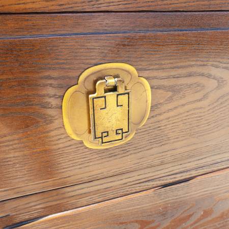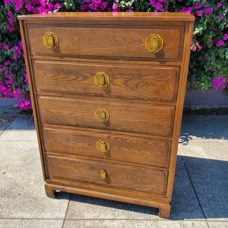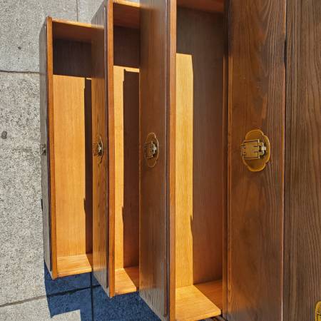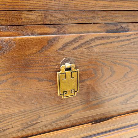 Cool piece from the "crafstmen of fine solid wood furniture". Finish actually in great condition with what little scratches on the top melt away with a little Old E. Nice carved oak details with a walnut hued finish that leaves soft texture of the wood grain. Is missing what I assume is the orginal dividers (but one) and the holders have become brittle/breaking. Also the brass back plate for the bottom pull will need to be sourced unless you intend on ditching the Chinoiserie vibe and replace the set. Drawers could use some waxing, but overall work well enough and have stops preventing pulling all the way out.