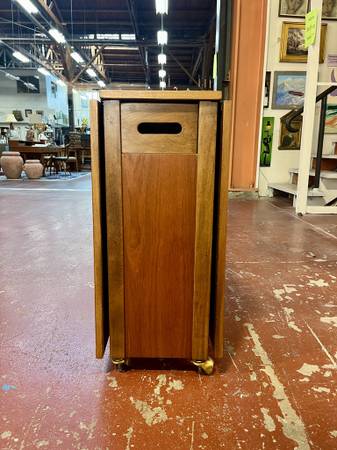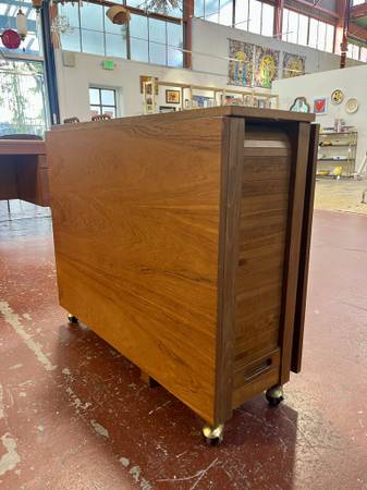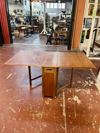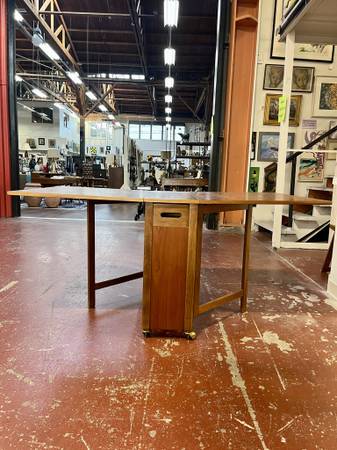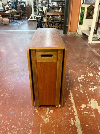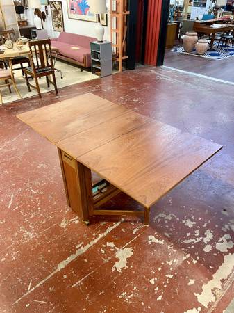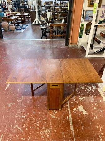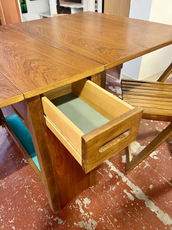 Vintage Mid Century Teak Folding Dining Table & Chairs By Aldo Jacober. 2 Drop Leaves, 4 Folding Chairs, Silverware Drawer. Made in Romania. Dimensions: 34” W x 13” D x 29”H Each Leaf (2): 34” W...