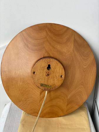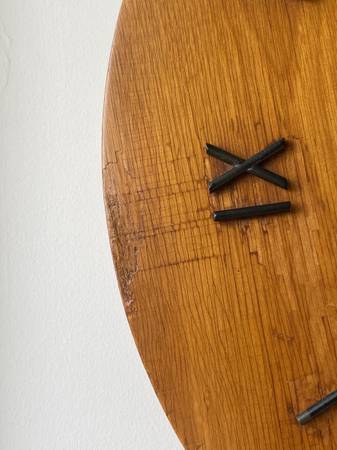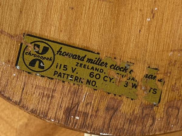 Uncommon wall clock designed by George Nelson & Associates for Howard Miller, 1964. Unique conical design with concave face and black center, raised black metal roman numerals, and original hands, including the second hand. The majority of the original label remains intact on back side. Measures 14" in diameter, 3" deep. Overall condition is very good for age, in working order.