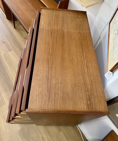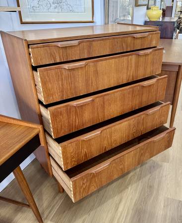 Vintage Mid Century Danish Teak Veneer 5 Drawer Tall Dresser. Made in Denmark. Measurements: 36”W x 17”D x 42”H