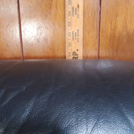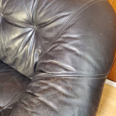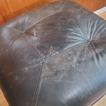 Super cool and inviting set from Brazilian modernist outfit. Likely 70s/80s, same style couch attributed to Jean Gillon, Romanian modernist designer who relocated to Brazil. Leather has mild to moderate distressing throughout, some scratching on the upper portion of left arm of chair and some more noticeable on top of ottoman. One loose thread on the seam of the ottoman top. Wood frame in good condition, high gloss over lacquer. Leather paneling on chair base a little loose, gently hammered some tack in post sourcing.