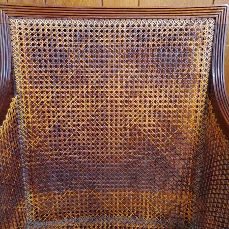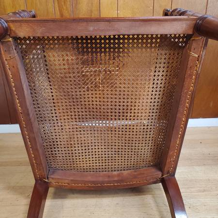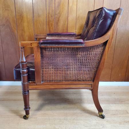 Very good vintage condition with classic style and craftsmanship. Only real blemish is the top tuft button missing, though shows some expected signs of age/wear. Nail head trim on the arm rests that have held up well. Sturdy and rolls decently. Caned back, base and wings nearly entirely intact throughout and still holds strong beneath the base cushion.
