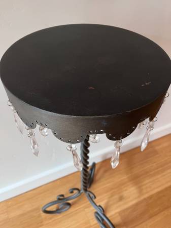 Round tabletop with scalloped edge detailing and hanging crystal-style drops for a touch of sparkle.