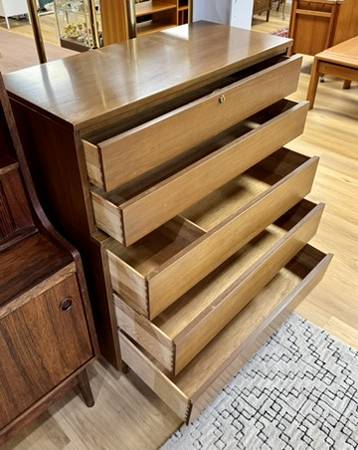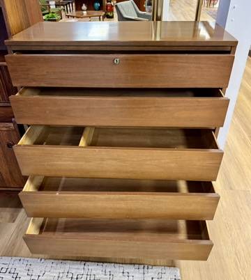 Vintage Mid Century Walnut 5 Drawer Tall Dresser. Measurements: 36”W x 18”D x 43”H