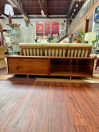 Walnut Low Credenza, Two Shelves Lighted Section, Sliding Glass Doors Walnut with Brass Accents — RESTORED— Dimensions: 70”W x 16”D x 18”H