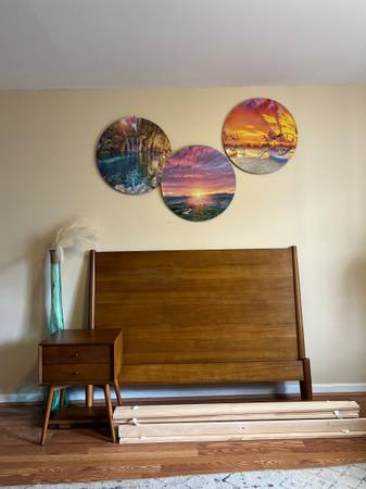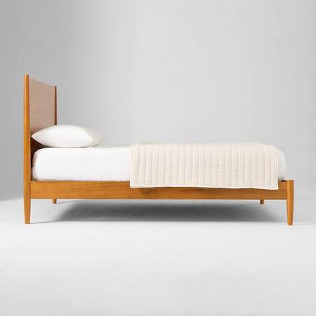 Doweled headboard edges and tapered wood legs give this bed its mid-century modern style.
