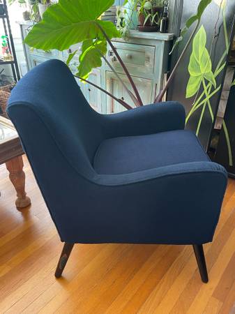 West Elm arm chair in performance weave, blue. Chair itself in excellent shape and comfortable, one back leg has some cosmetic damage that can be remedied by re-staining an already smoothed surface....