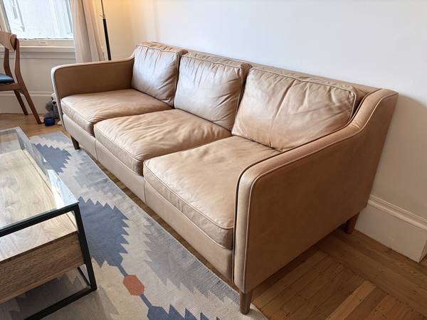 Great looking couch. In good condition, but faded from the sun. The fading is significant, but looks good and could be improved with some conditioning. Will include pictured pillows.