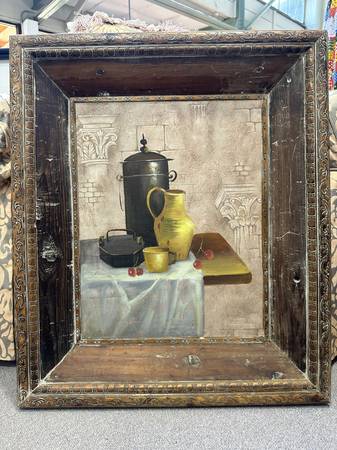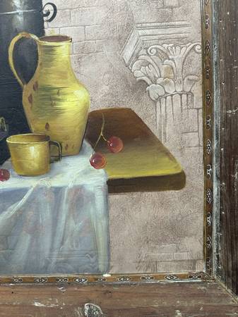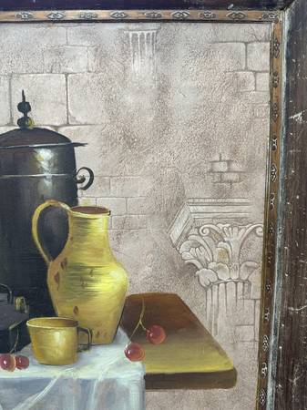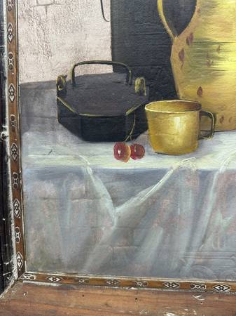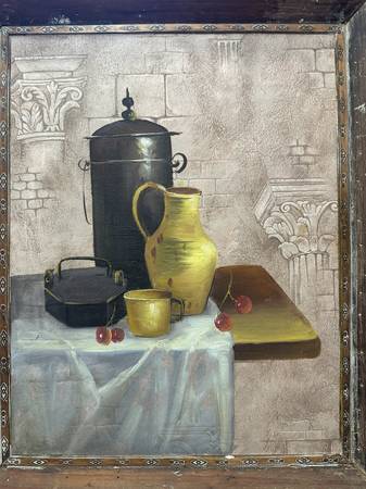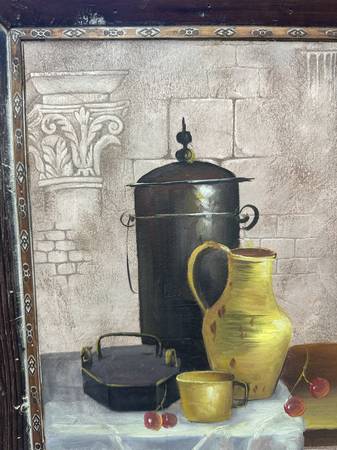 Yellow Picher & Bronze Cookware Still Life Painting - Painted Directly on the Wood Frame Measurements: 22”W x 26.25”L