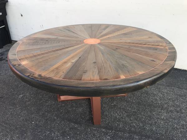 One of a kind reclaimed Redwood round table 60" round table with brass inlay. Custom design and sizes available Free delivery in the Bay Area Reclaimed Redwood, reclaimed wood table, Round table,...