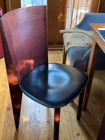 Vintage 1980s Postmodern set of unique Italian Calligari’s dining chairs. Beautiful design, leather seats. Here’s a detailed description: https://www.ebay.com/itm/134690994521 Sold as a pair. One...