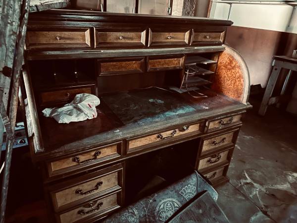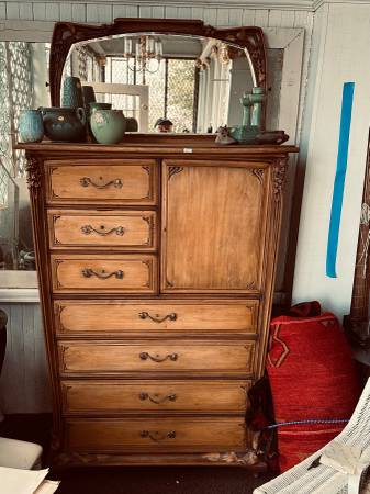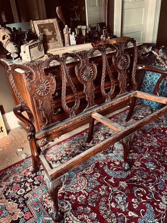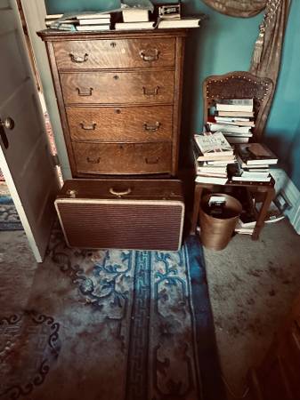 Bedroom set, desk, settee, individual chairs, stunning gentleman s chest. Antique bed and dresser , oriental rugs, Chinese rug, old sf street lighting , old mantle clocks. Rare English antique signatures Duke and Duchess of Windsor and others from that era. A couple of David GilHilhooly pieces, an interesting Mel Ramos signed print, David Gilhooly ceramic piece, antique desk, old flour bin table antique pine cabinet, large Native American late Yei Rug