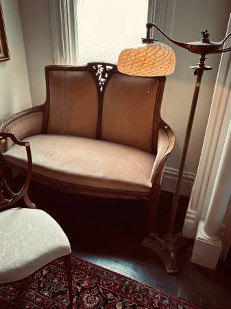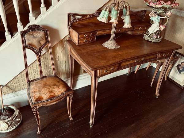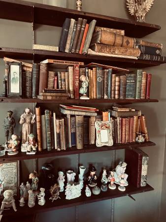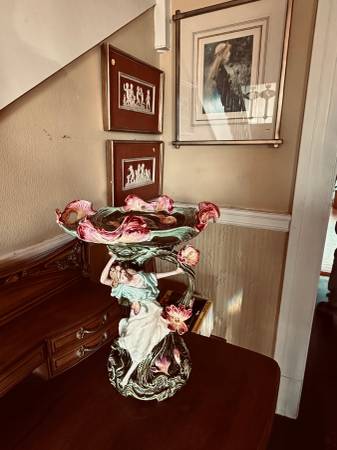 Fri and Saturday the October 17th and 18th. From 10 to 3 each day. Collectors estate where you will find paintings, prints, tons of beautiful art books, art nouveau furniture, glass pottery beautiful large set of Meissen blue onion, other blue and white European blue and white, cobalt blue glass , art pottery Roseville, antique Quoizel hand blown period shades. Tiffany pieces, two Steinway player piano, one