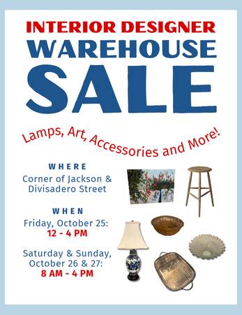 Corner of Jackson and Divisadero Street October 24 12-4pm October 25 & 26 8-4pm Lamps, Art, Accessories, and More!! Furniture / Original artwork / Home decor / Textiles / Barware / Books /...