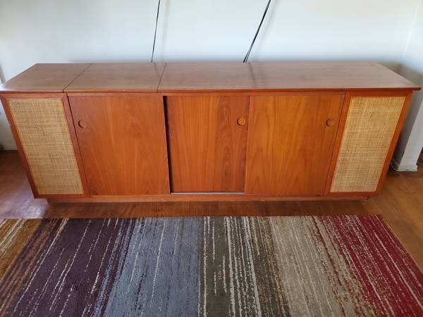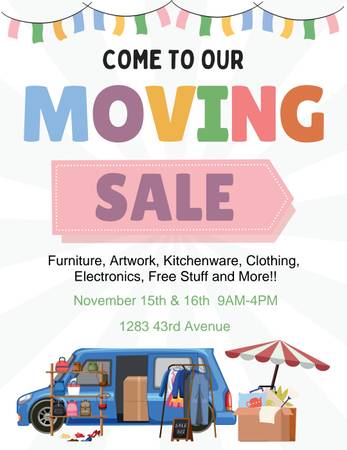 Moving Sale 11/15 & 11/16 9AM-4PM Furniture, Artwork, Kitchenware, Men's Clothing and Shoes Red Leather Chairs Kitchen Island L:51 W:18.5 H:36 Credenza L:93.5 W:22.5 H:22.5 Mid Century Dresser...
