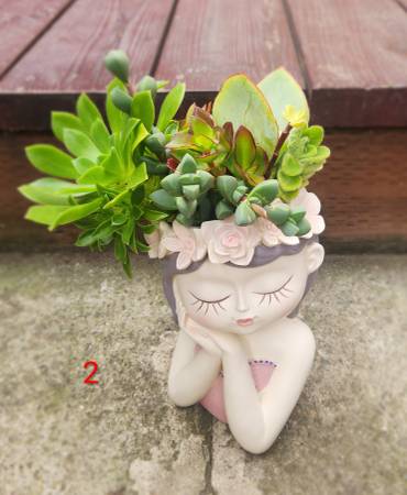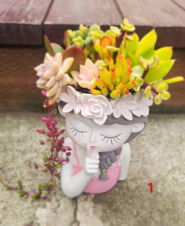 Beautiful mixed live succulents arrangements @ cute girl planters (about 8.27" height) sale for $35 per each one in cash payment and local pick up close to Eats Restaurant @50 Clement Street, Inner Richmond District, SF, Ca. 94118