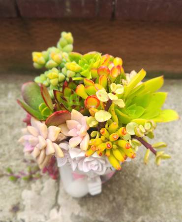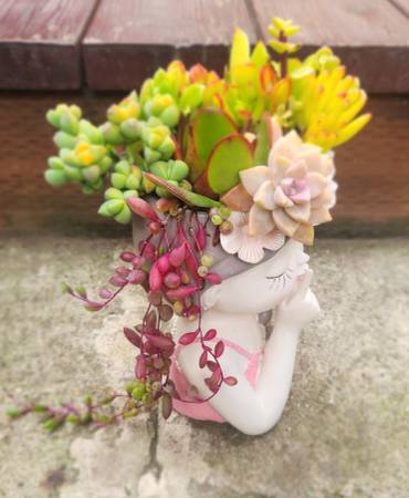 Beautiful mixed live succulents arrangement in a cute girl planter - $35