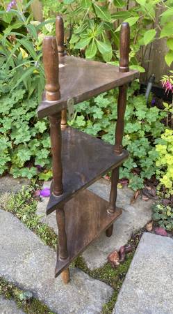 Vintage corner wall shelf made of real wood. The shelf is also designed to stand on its own when placed on top of a table or counter-like surface Two available. 19 1/2” tall, 9 1/2” deep, 13 1/2”...