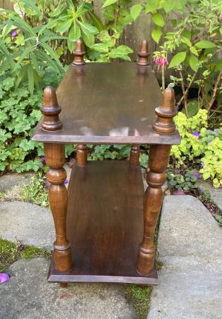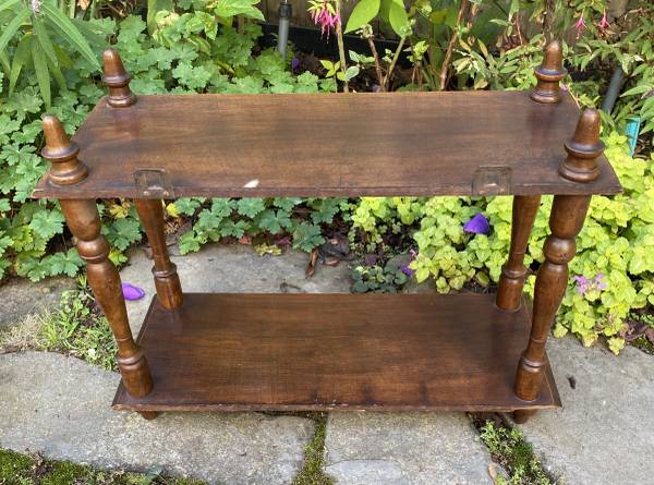 The vintage Victorian style real wood hanging wall shelf is ready to hang with its brass mounting tabs. The shelf is designed, as well, to stand on its own. 15 1/4” tall, 18 1/2” wide, 8” deep. Two...
