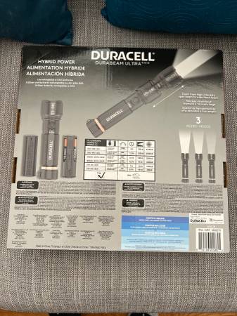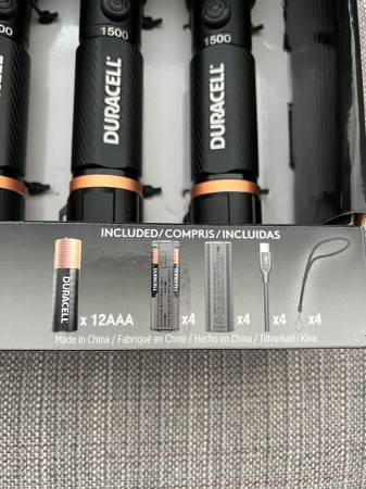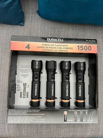 Duracell Hybrid LED Flashlights. 1500 Lumens, 4 Count. Comes with 12 AAA batteries, 4 Rechargeable cords. Brand new in factory box.