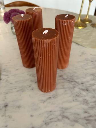 • 4 x tan fluted pillar candles (unscented, 2 x 6”) $15