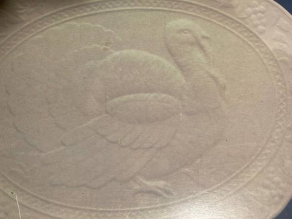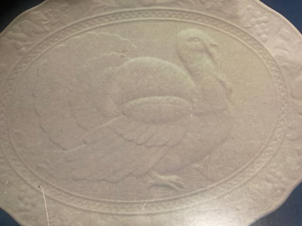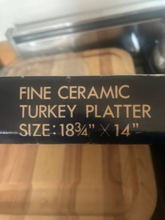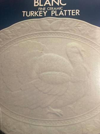 -Never used -perfect condition -Large white oval serving platter -Ceramic -Raised turkey design -With box -Made in “Japan” is on the back -size is: 18 3/4” X 14” $18.00