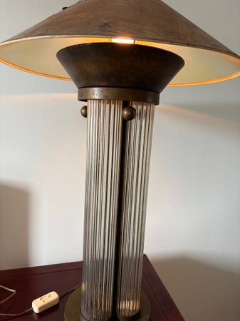 Lamp is 33"h x 21" wide, including shade. Shade is peeling, giving it a distressed/vintage look. Fully functional.