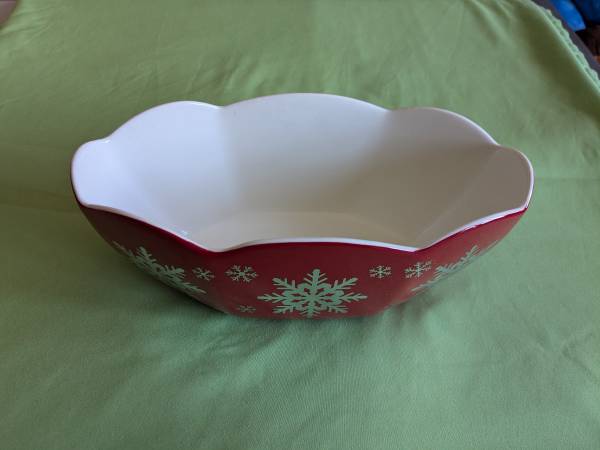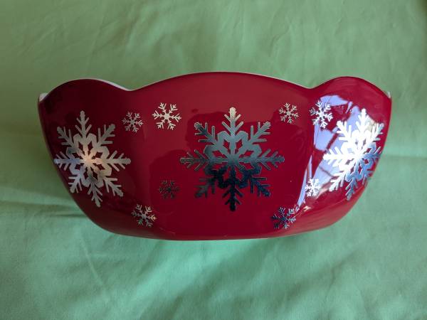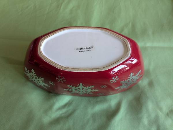 Hi. I'm selling my Teleflora Holiday Red with Silver Snowflakes festive Bowl. In like new condition. Quite beautiful and well made. The colors are simply festive. Can also be used as a Winter Decor or Planter. Also can be used as a storage organizer to put your pens and sticky pads in. Dimensions: 9 1/2" x 4 1/2" x 3 7/8"H. Selling now for $30. Cash only
