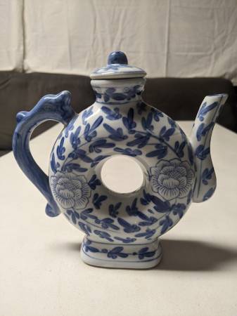 Hi. I'm selling my vintage Porcelain Blue & White Asian Doughnut Shaped Teapot. In like new condition. No damage or chips anywhere. Looks amazing and can be a statement piece in your kitchen or dining table. This stylish teapot is hand-painted and has a floral flower theme. Dimensions: 7.25" x 7" x 2.25". One of a kind. Selling this beauty now for $40. Cash only
