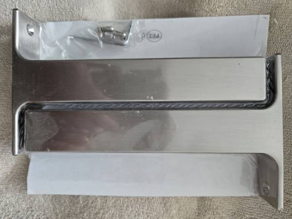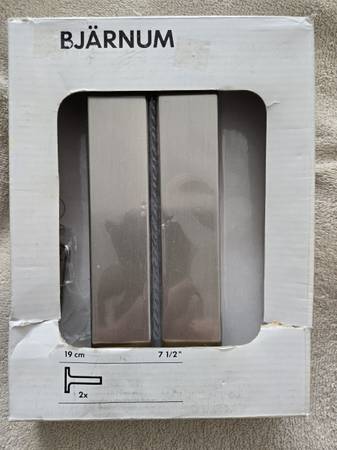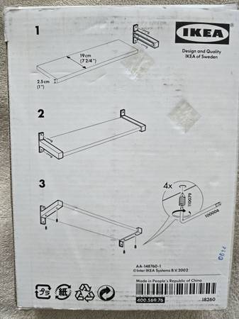 New Ikea metal shelf brackets (pair) in sealed plastic wrap. In original box which shows significant wear & tear. Made to support 7 1/2" Width x 1" thick shelf.