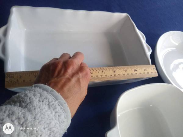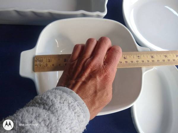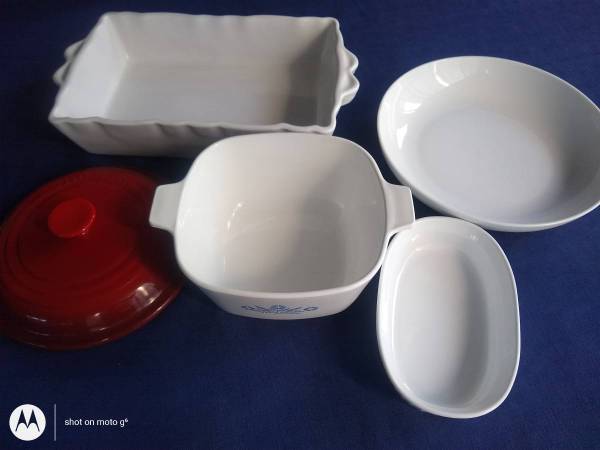 various white ceramic serving ware or bake ware corning ware 7 inch square deep casserole $15 corning ware oval ramekin $6 crate and barrel white serving dish $8 white rectangular casserole baking...