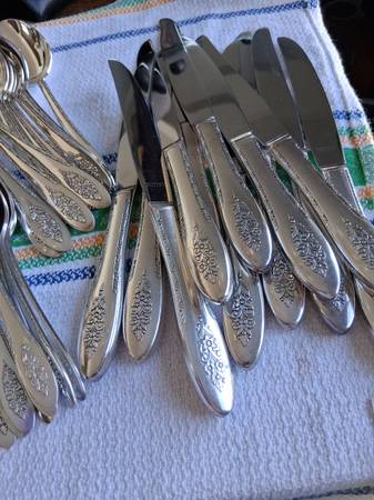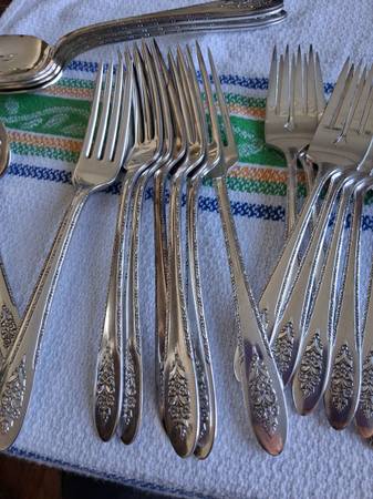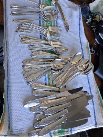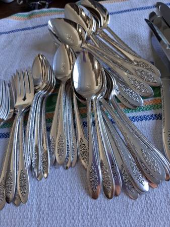 Wm.A Rogers A1 Plus Oneida ,Lady Stuart, utensils.4 Large serving spoons,1 sugar spoon,1 master butter knife,8 forks,11 salad forks,23 teaspoons,12 soup spoons,12 knives(Not sharp).71 pieces.Everything for $30.