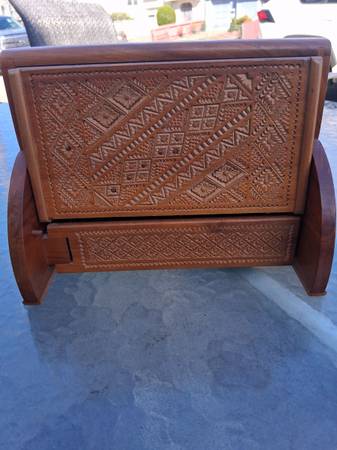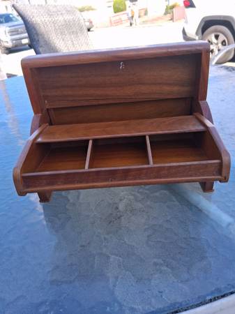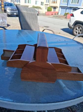Wooden Trinket holder that opens up.Yugoslavia.Closed 7" tall,8.7" long.$15. ..Only replies with phone number will be answered,no texts, cash only..