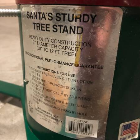 For a large tree: painted steel stand, for larger trees, from 6 feet all the way up to 11 feet. ($35 obo). This stand is solid steel and it weighs about 10 pounds. Search "Santa's Sturdy Tree Stand" for info from retailers. (Two available: one with an oval sticker and one with a rectangular sticker.)