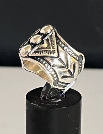 Beautiful, solid and highly detailed sterling silver ring by world renown Navajo silversmith, Sunshine Reeves. An exquisite ring with detailed arrows and 3 raised teardrops on the top. Marked SUNSHINE REEVES STERLING.