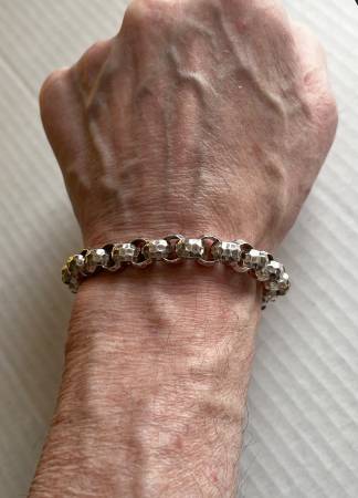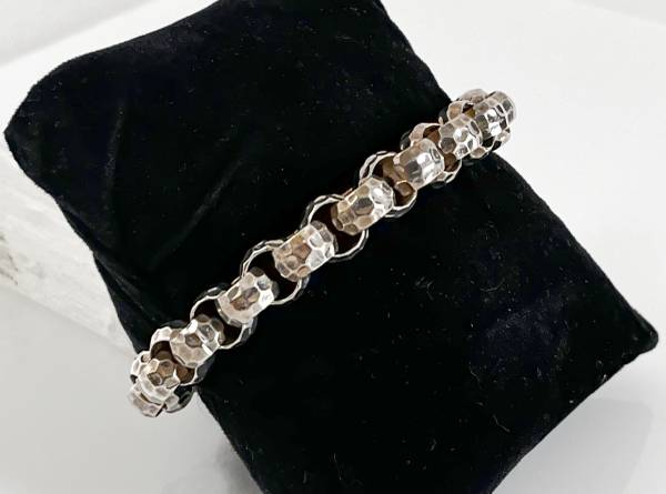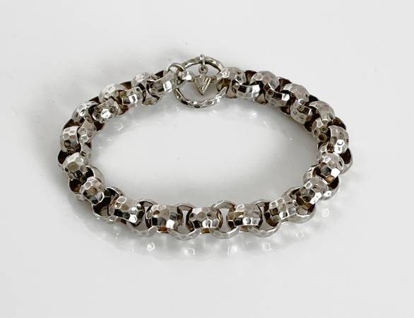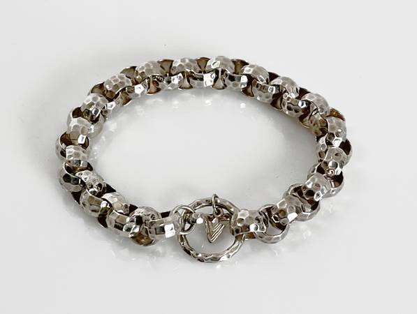 Gorgeous hammered sterling silver rolo chain bracelet with toggle clasp by SIPALDA. Measures 8" in length, 3/8" wide and weighs an impressive 48.1 grams. Marked 925 with the double arrows and features a small arrowhead charm. Fits up to 6 3/4" wrist.